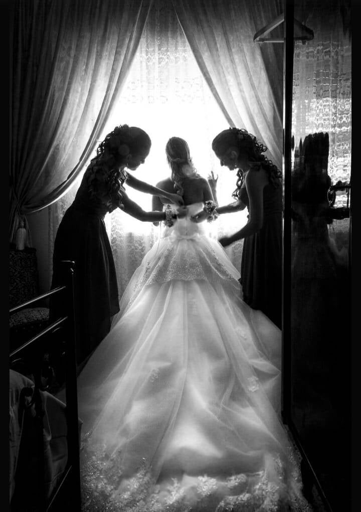 No fue construida. No hubo luz estudiada, ni composición planificada. Había poco espacio en ese cuarto — un vestido enorme que acomodar, gente moviéndose, la confusión normal y hermosa de un día de fiesta.